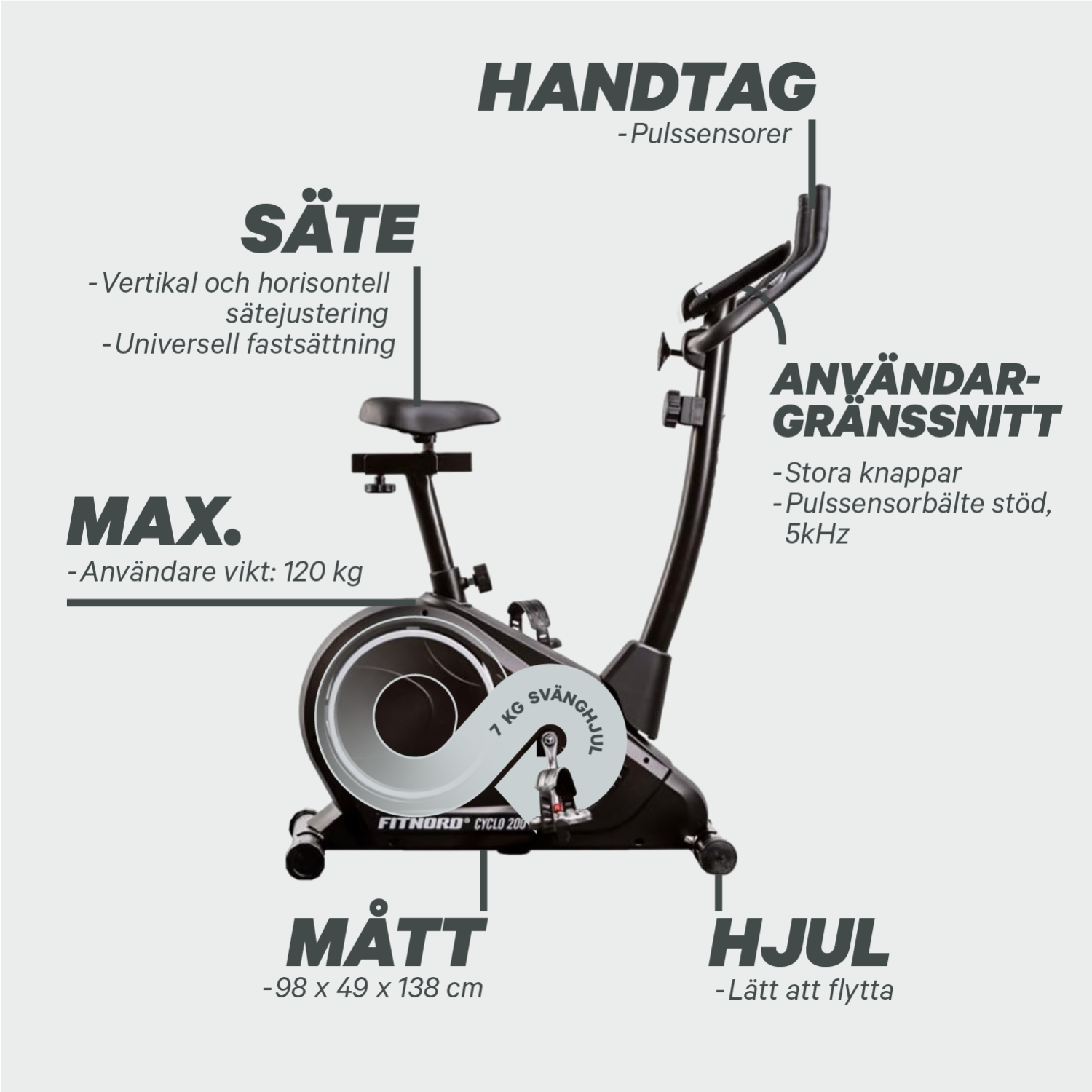 FitNord Cyclo 200 är en mycket prisvärd motionscykel för hemmaträning med ett svänghjul på sju kilo och en maximal användarvikt på 120 kilo. Cykeln är lättanvänd, har pulshandtag och god trampkänsla med åtta motståndsnivåer.
