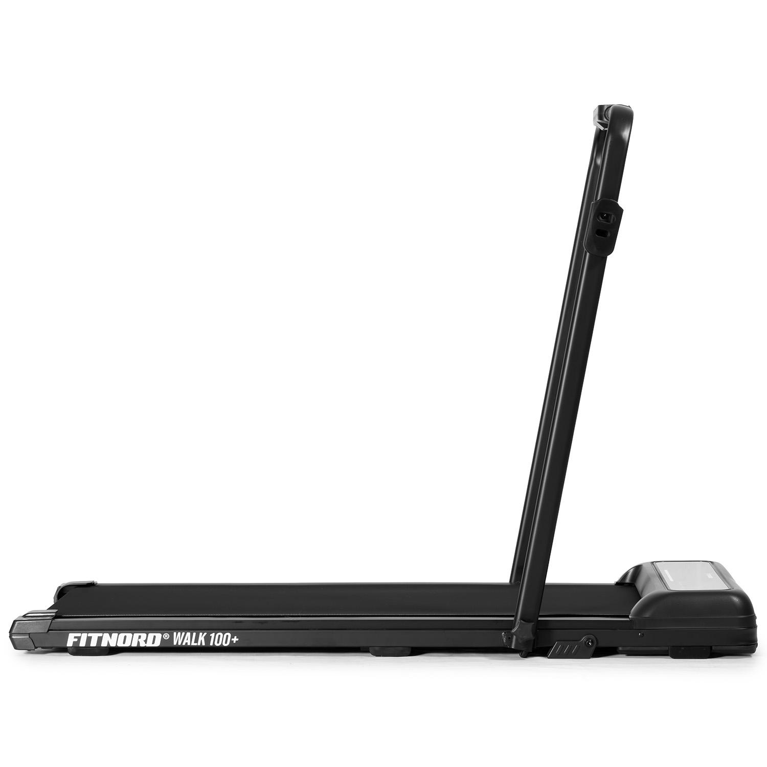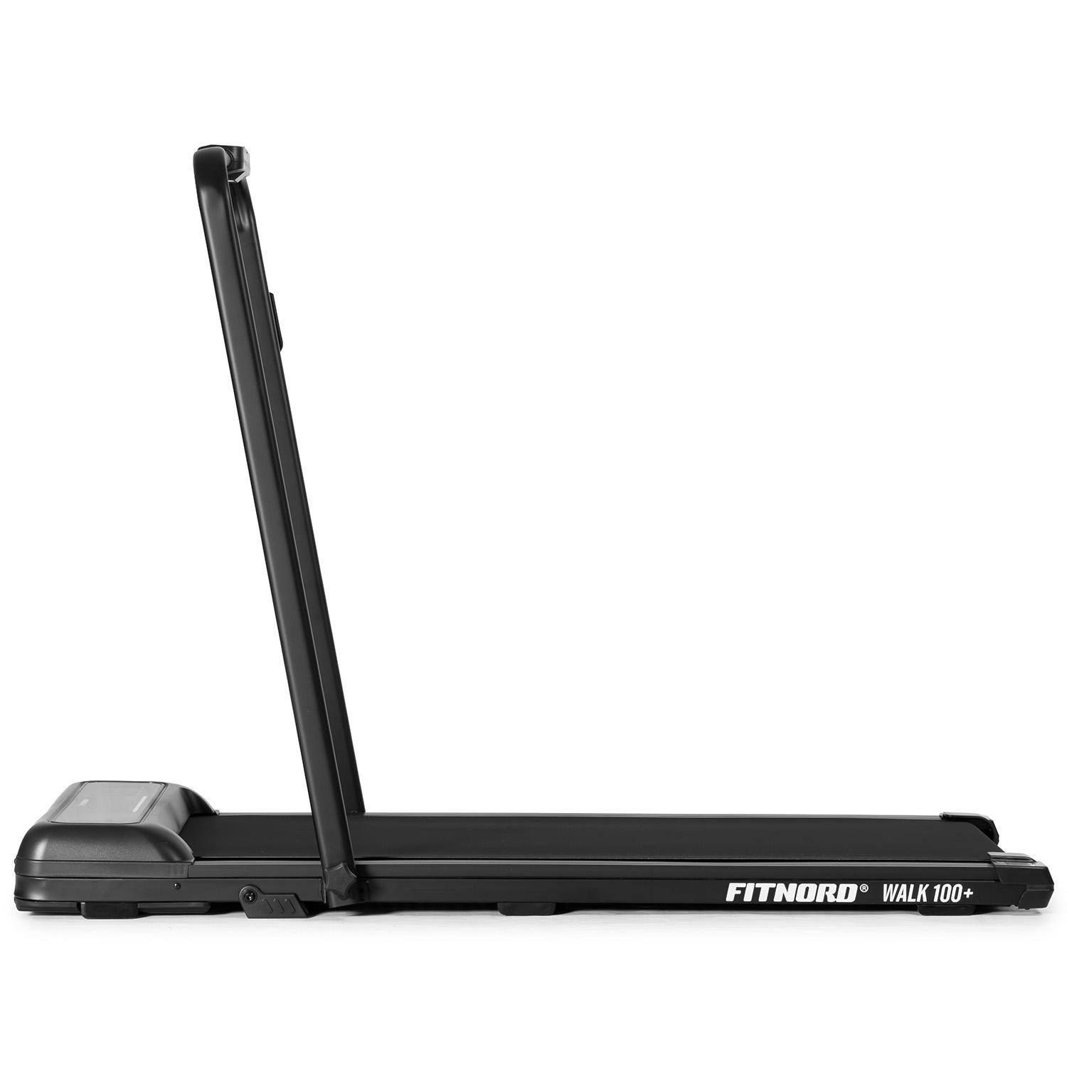 FitNord Walk 100+ är ett kompakt och lättflyttat gåband där du kan gå eller springa (1-10 km/h). Enheten är endast 129 x 60 cm, vilket innebär att den inte kräver mycket plats och får plats under ett skrivbord. Handtaget fälls enkelt med ett smidigt snabbfäste, vilket gör att bandets tjocklek endast är 11,5 cm och möjliggör förvaring t.ex. under sängen eller soffan. Det tysta bandet stör inte utan ger möjlighet till lätt motion även under arbetsdagen! Gåbandet kan användas både med handtaget uppe och nedfällt.