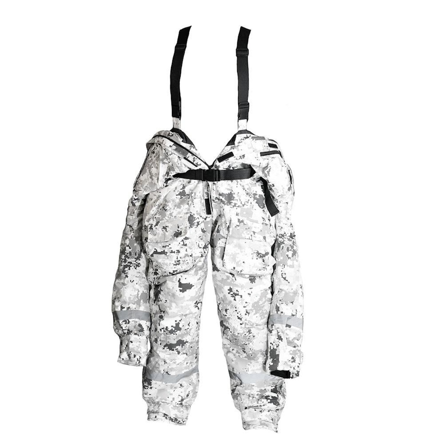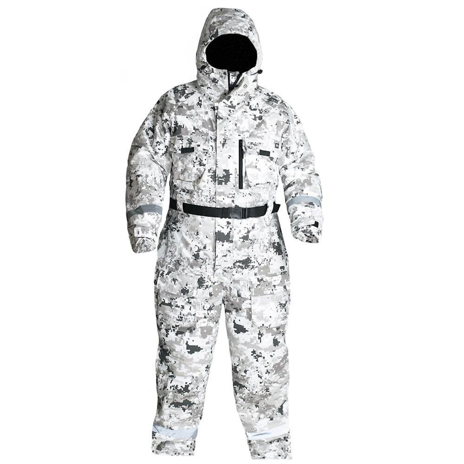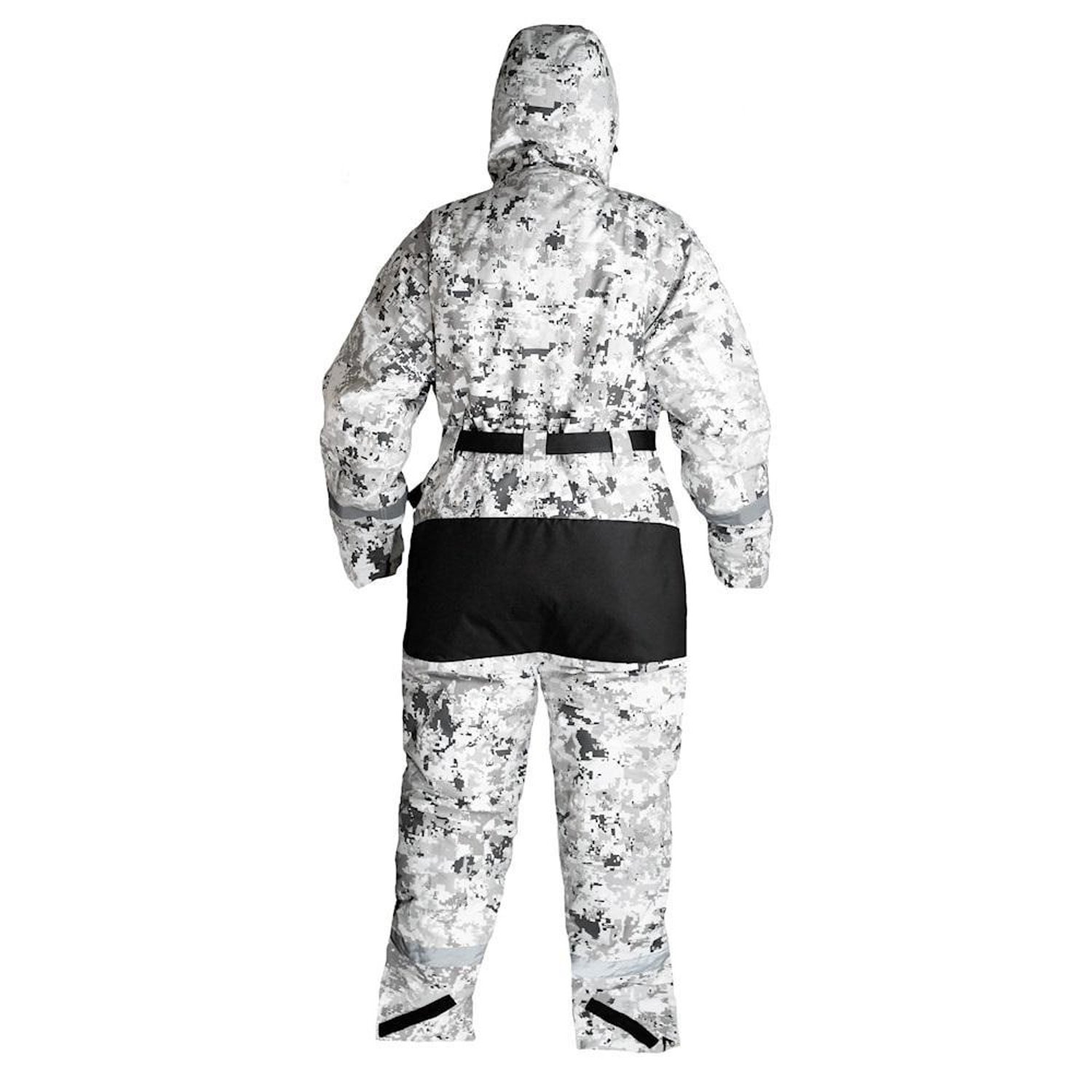 Overallen har designats med många praktiska funktioner särskilt för dig som behöver använda många tillbehör, till exempel under isfiske. Det finns bland annat hållare för isdubbar på bröstet, fem fickor med dragkedjor, två kardborreförsedda fickor och D-ringar vid skärpet. För komforten och värmehållningen är overallens krage hög och försedd med fleecefoder.