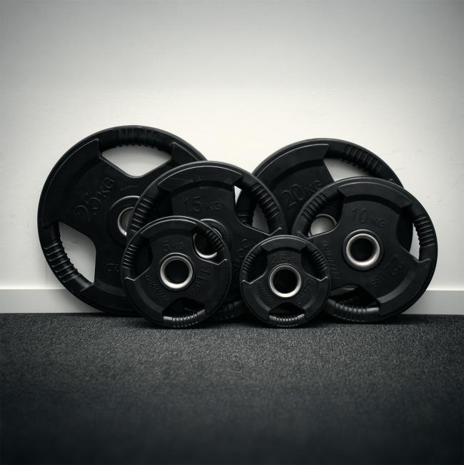 De tre grepphandtagen på viktskivan underlättar flytt av vikterna och möjliggör användning av dem som extra vikter, till exempel vid magövningar.