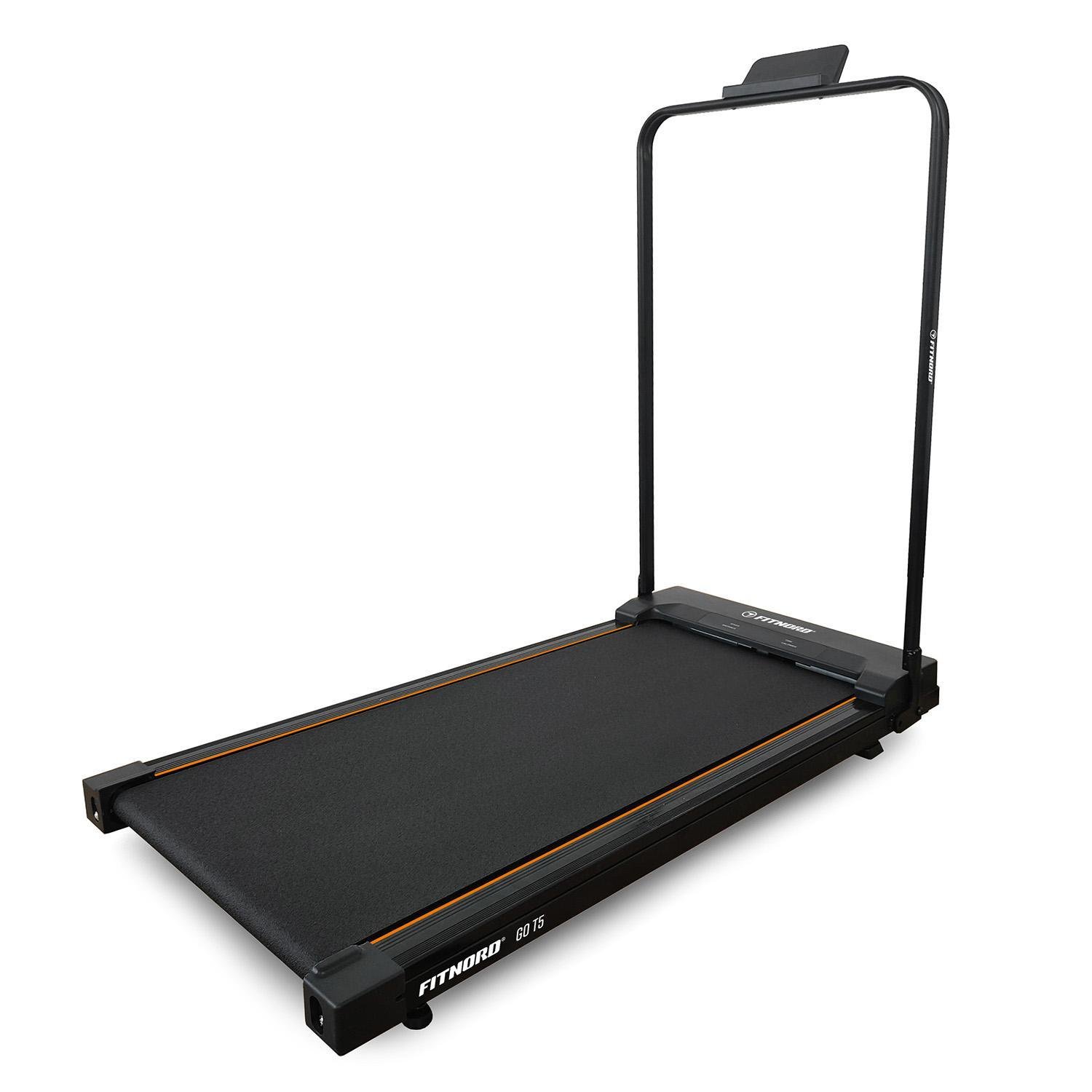 FitNord Go T5 är ett kompakt och lättflyttad gåband som kan användas för både lugn och rask promenad (1–6 km/h). Enheten är endast 102 x 48 cm stor, vilket innebär att den inte kräver mycket utrymme och får plats under ett skrivbord. Det avtagbara handtaget gör det möjligt att använda enheten både med och utan handtag. Handtaget gör rörelsen säkrare, så gåbandet passar användare på alla nivåer. Enhetens tjocklek utan handtag är endast 10,5 cm, vilket gör att den enkelt kan förvaras exempelvis under en soffa eller säng. Den tysta mattan stör inte utan ger möjlighet till lätt motion även under arbetsdagen! Handtaget är fäst med två skruvar, vilket gör borttagning och montering enkel. Handtagets hållare möjliggör smidig användning av smarta enheter under promenaden.
